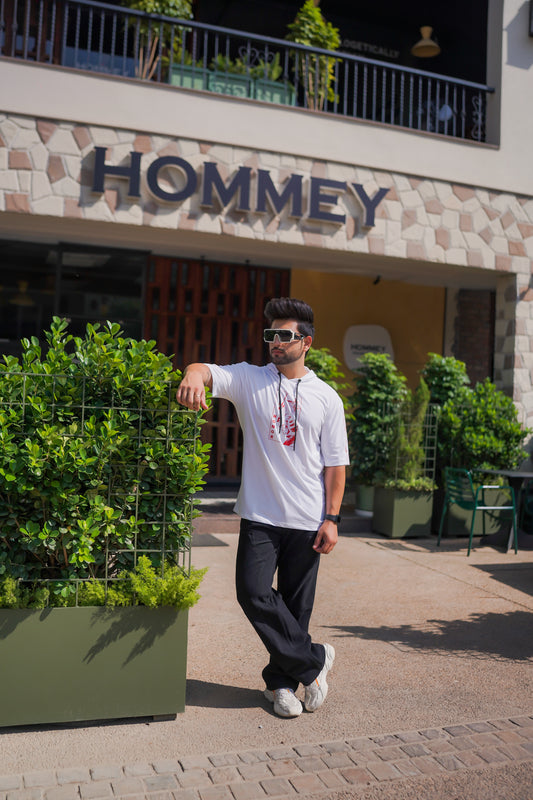 Men Oversized Hooded Neck Drop Shoulder Printed Cotton T-Shirt