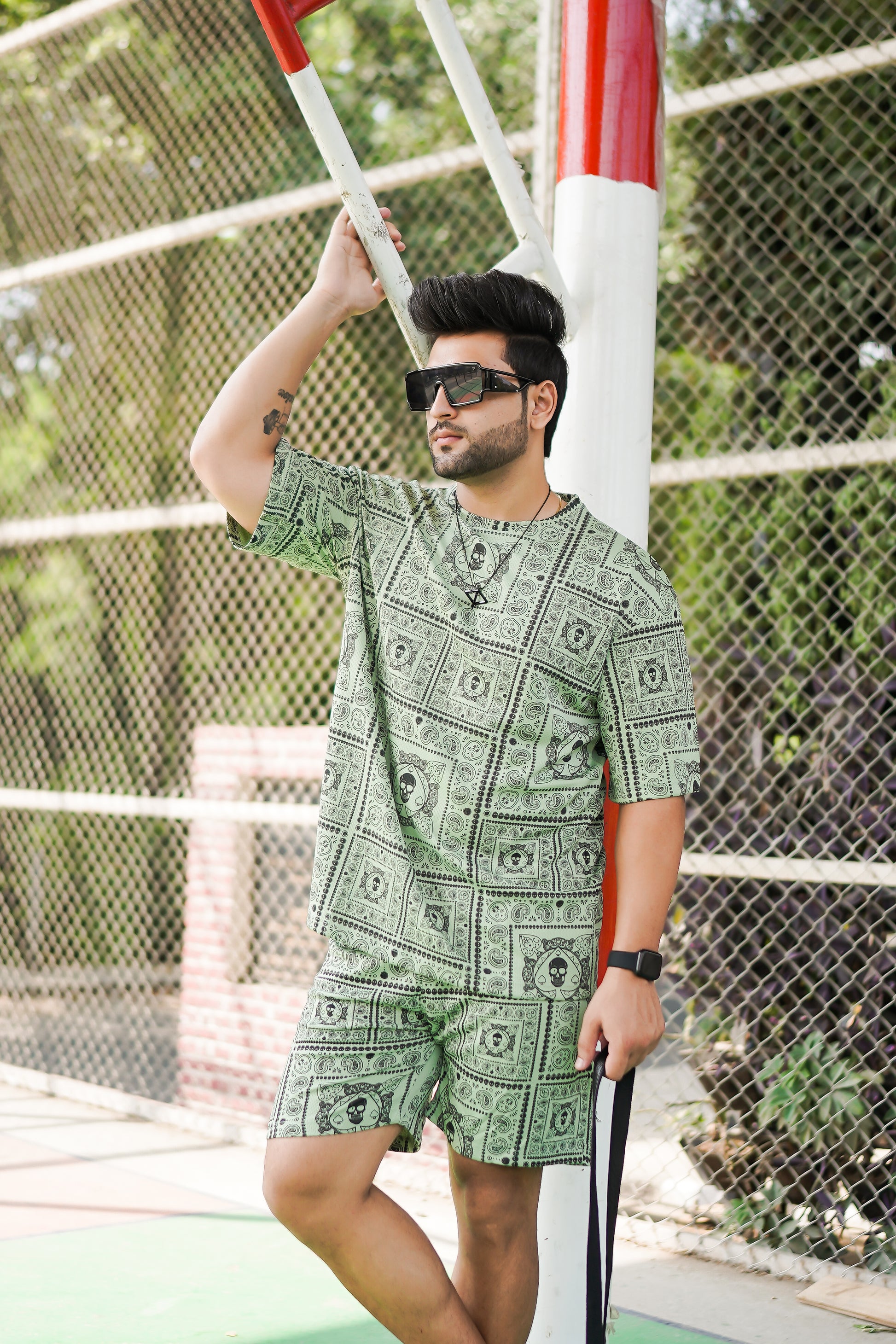 White cotton satin floral printed half sleeves buttoned shirt paired up with matching coordinated floral printed cotton satin shorts with side pockets.
