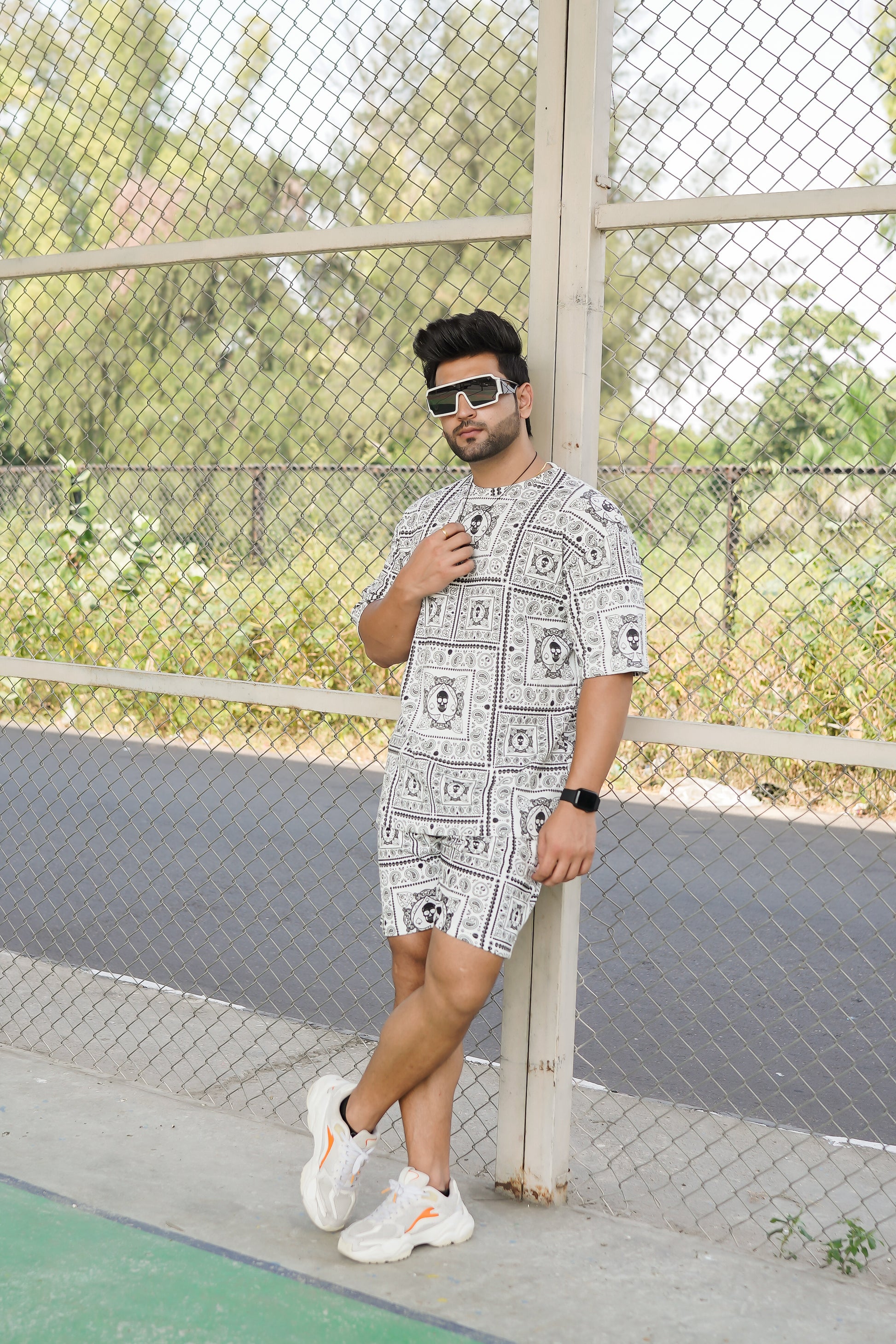 White cotton satin floral printed half sleeves buttoned shirt paired up with matching coordinated floral printed cotton satin shorts with side pockets.